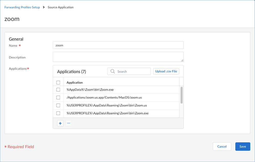 Enter a meaningful Name for the application that you want to add.Click + in the Source Applications table and enter the complete path of the application. You can add one or more applications to the table.You will select these applications when setting up the forwarding rules in a forwarding profile. To exclude application traffic, select Direct connectivity when configuring the forwarding rule. Prisma Access Agent sends these applications through the physical adapter on the endpoints rather than the tunnel (the virtual adapter). If you choose to include application traffic, select the Best Available - Fail Safe (macOS and Windows agents only), Best Available - Fail Open, or your own configured connectivity option when configuring the forwarding rule.