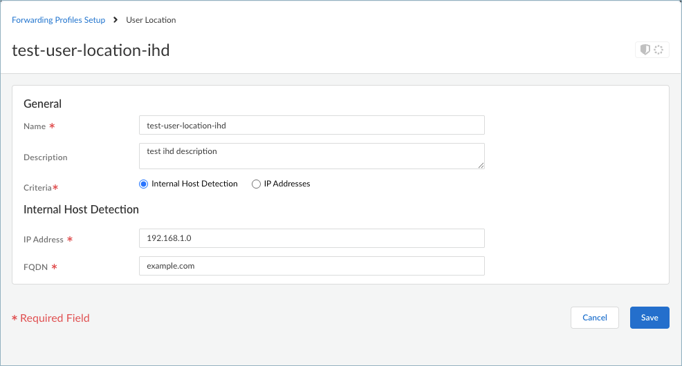 Enter a meaningful Name for the user location that you want to add.Select Internal Host Detection for users on the internal corporate network, or select IP Addresses to steer traffic based on private IP addresses.- Internal Host Detection—Specify the IP Address and FQDN for your internal network. Only IPv4 addresses are supported.If enabled, the Internal Host Detection setting in the agent app settings takes precedence over the Internal Host Detection setting in forwarding profiles. Unlike the Internal Host Detection setting in the agent app settings, the Internal Host Detection rules in forwarding profiles don't suppress the tunnel.
