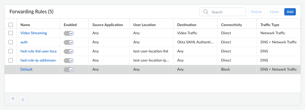 Click Add to save the forwarding rule.In the Forwarding Rules table, adjust the priority of the rules in a top-down manner, such that the most specific rules go first and the least specific rules go last in the table. You can select the checkbox next to a rule and select Move Up or Move Down.(macOS and Windows agents only) Configure the Traffic Enforcement options to determine how you want traffic to be enforced.