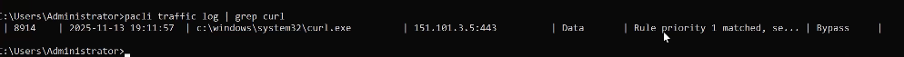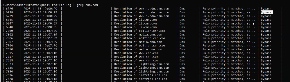 Set the rule priority to ensure bypass rules are evaluated in the correct order relative to other forwarding rules. You can select a forwarding rule and move it up or down in the Forwarding Rules table.Select a Traffic Enforcement option if needed.Save your forwarding profile settings.Push the configuration to deploy the bypass rules to your Prisma Access Agent deployment.After deploying the configuration, verify that bypass rules are working correctly on and endpoint that has the bypass rule configuration.- Use PACli commands on an endpoint to monitor traffic processing and confirm that bypassed traffic shows the Bypass connectivity in traffic logs.For example, you set up a forwarding rule to bypass the *.cnn.com destination and you want to verify the traffic from *.cnn.com is bypassed.