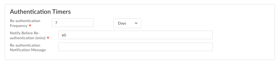 Configure the Notify Before Re-authentication timer by entering a value in minutes between 5 and 120. (Default: 60 minutes)(Optional) Configure the Re-authentication Notification Message by taking one of the following actions:- Enter custom text with a maximum of 127 characters.