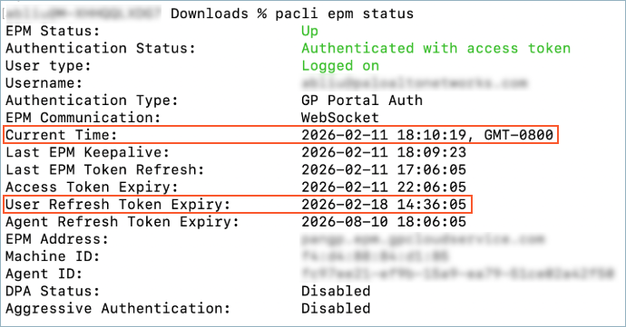 Save your configuration.Push your configuration to the gateway.Verify that agents receive and apply the re-authentication timer and gateway session timeout settings.- On an endpoint running Prisma Access Agent version 26.1.1 or later, open a terminal or command prompt.Run the following command to check the Endpoint Manager status: