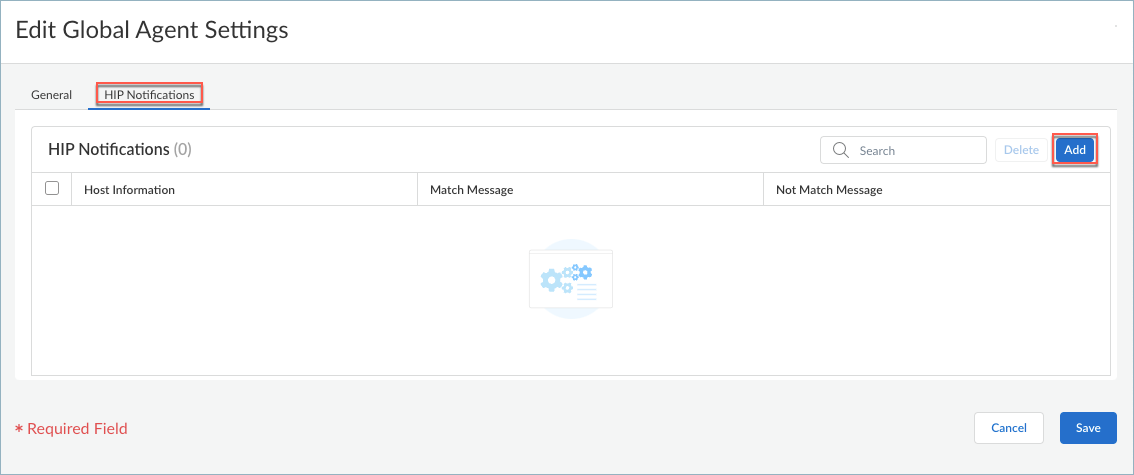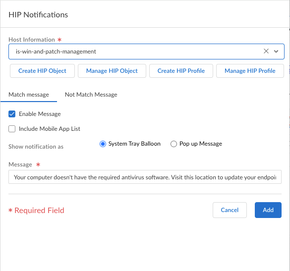 If there are no HIP Profiles, you need to create a HIP Profile.Depending on whether you want to display the message when the corresponding HIP Profile is matched or not matched, select Match Message or Not Match Message. In some cases, you might want to create messages for both a match and a nonmatch, depending on what objects you are matching and what your objectives are for the policy.Select Enable Message, and then select whether you want to display the message as a System Tray Balloon or a Pop Up Message.Enter your Message text and then click Add.Repeat this procedure for each message that you want to define.