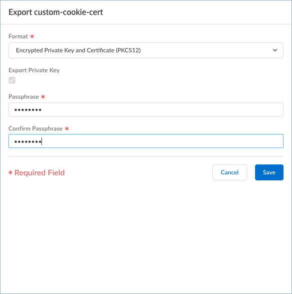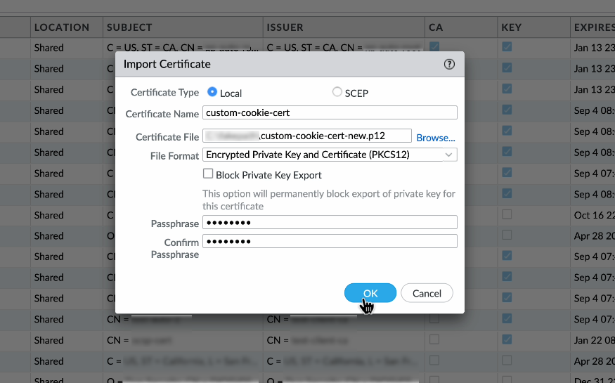 Save the export settings. The certificate is downloaded to your computer.Import the authentication override certificate to Panorama.- Log in to Panorama as the administrator and click Panorama.Select DeviceCertificate ManagementCertificatesDevice Certificates.Click Import Certificate.Enter the Certificate Name for the authentication override certificate that you exported from Strata Cloud Manager.In our example, the certificate name is custom-cookie-cert.Browse to the location where you downloaded the certificate. Select the certificate and click Open to upload it.The certificate filename must begin with a letter or number, and can have alphanumeric characters, spaces, commas, dashes, and underscores. If the filename has other characters, rename it to include only the valid characters and upload the file again.Ensure that the file format is Encrypted Private Key and Certificate (PKCS12).Enter the same Passphrase that you used for the authentication override certificate that you imported and Confirm Passphrase.