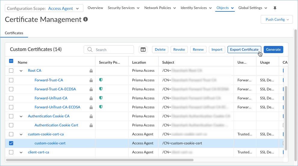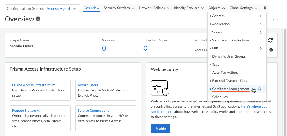 Select ConfigurationNGFW and Prisma AccessConfiguration ScopeAccess AgentObjectsCertificate Management.