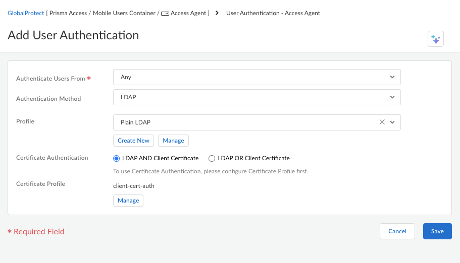 To use certificate authentication, you need to first create a certificate profile in ConfigurationNGFW and Prisma AccessConfiguration ScopeAccess AgentObjectsCertificate Management.
