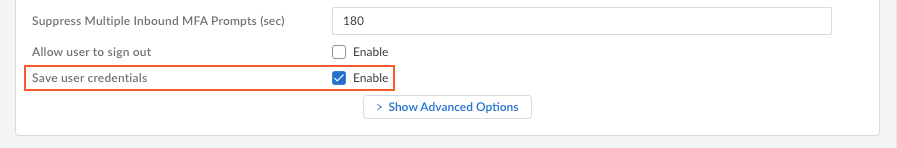 5. Enable the Save user credentials option in the Prisma Access Agent settings to provide seamless authentication across device states like sleep-wake cycles, network changes, and system restarts without repeatedly prompting the user for credentials.