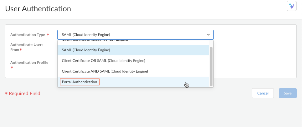 After you select Portal Authentication, the other authentication fields will no longer appear since authentication will be handled by the GlobalProtect Portal.