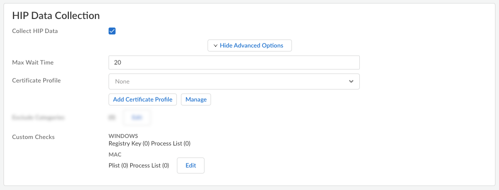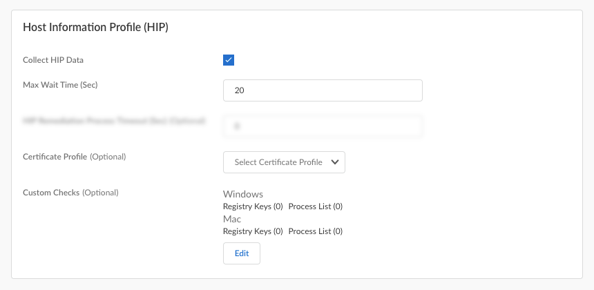 You can define custom HIP data that you want the Prisma Access Agent to collect. When this option is enabled, the Prisma Access Agent collects data from the endpoints. (Not supported on Prisma Access Agent Linux)
