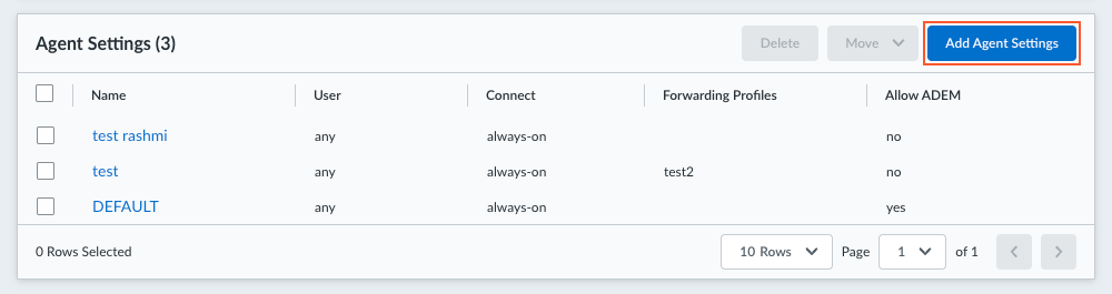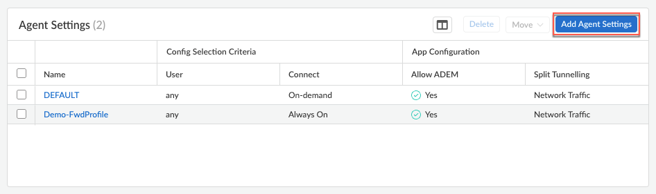 2. Select an existing agent configuration or Add Agent Settings to create a new configuration.