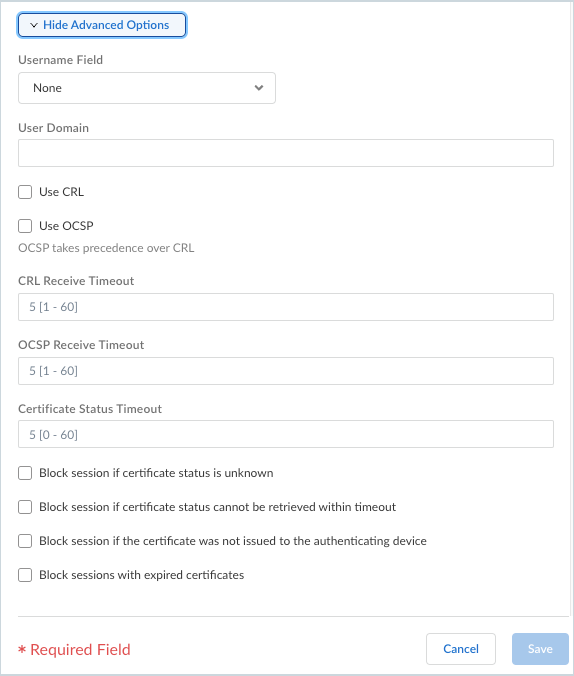 • Username Field—If Prisma Access Agent uses only certificates for gateway authentication, Prisma Access uses the certificate field you select in the Username Field drop-down as the username and matches it to the IP address for the User-ID service: