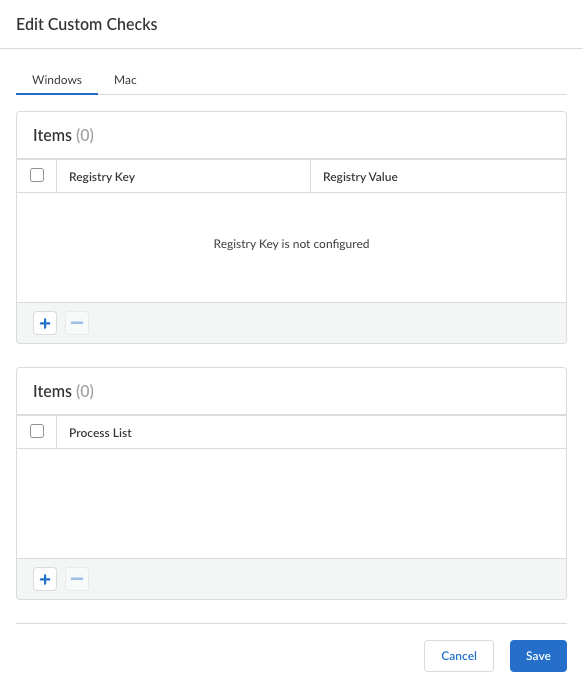 • Process ListAdd the processes you want to check for on user endpoints to see if they are running. For example, to determine whether a software application is running, add the name of the executable file to the process list. You can add a process to the Windows tab, the Mac tab, or both.