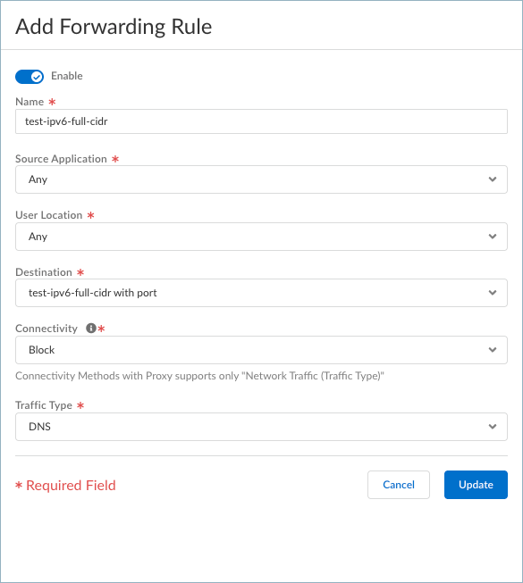 Save your settings.Select Push ConfigPush to commit your changes and push the configuration to the gateway.Add IPv6 addresses to forwarding profile destinations.- Navigate to the Forwarding Profiles Setup page.