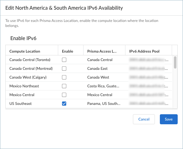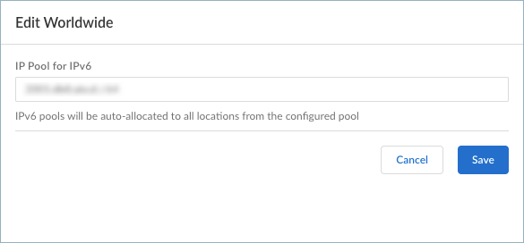 Assign an IPv6 address pool.- Go to ConfigurationNGFW and Prisma AccessConfiguration ScopeAccess AgentSetup and select the gear icon to edit the Infrastructure Settings.If you are on a coexistent tenant with GlobalProtect, select Filter ByPrisma Access Agent or All.In the IPv6 Settings section, select Worldwide and enter the IP Pool for IPv6.