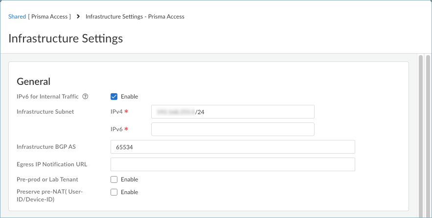 - In Strata Cloud Manager, Select ConfigurationNGFW and Prisma AccessConfiguration ScopePrisma AccessPrisma Access Infrastructure and select the gear icon to edit the Settings.Enable IPv6 for Internal Traffic and provide an IPv6 infrastructure subnet.