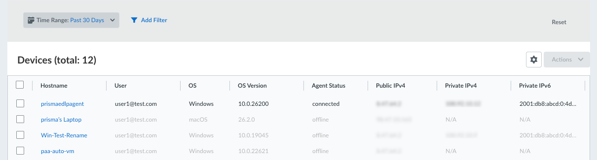 Repeat the steps for additional destination objects that require IPv6 support.Select Push ConfigPush to apply the forwarding profile updates.Verify the IPv6 configuration.- Connect a Prisma Access Agent in a dual-stack network environment where the endpoint receives both IPv4 and IPv6 addresses.Go to the Endpoint Manager inventory page in Strata Cloud Manager by selecting ConfigurationEndpoint Management.Locate the connected endpoint and verify that the Private IPv6 column display the assigned addresses.