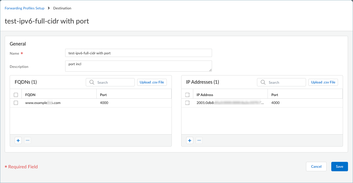 In Forwarding Profiles Setup, select the Destinations tab and select the destination object where you want to add IPv6 addresses.Enter the relevant IPv6 addresses in the IP Addresses section. Use the following guidelines when adding IPv6 addresses:- Add an IPv6 address using standard notation such as 2001:db8::1234:5678 for a single host.