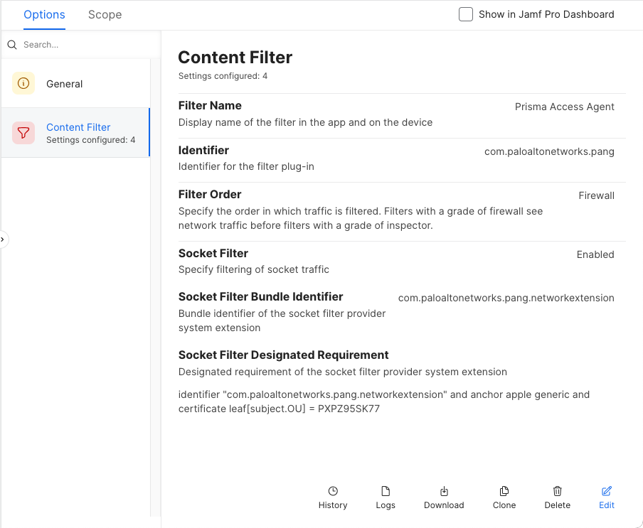 3. Configure a Content Filter payload to push the Prisma Access Agent content filter to your users' devices and suppress the following prompts on the endpoints: