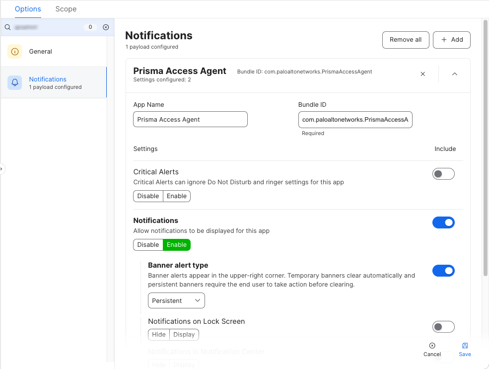 4. Create a Notifications payload to configure how Prisma Access Agent notifications are displayed on the end users' devices.
