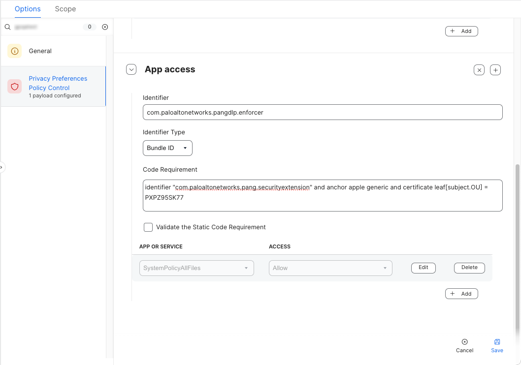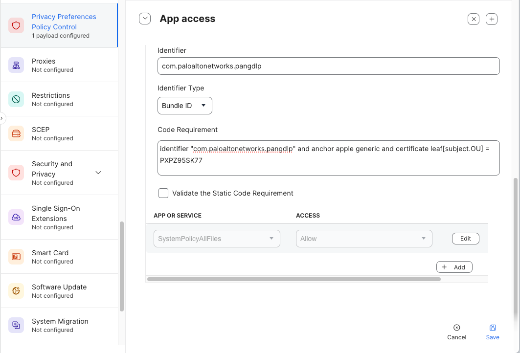 5. Create a Privacy Preferences Policy Control payload to configure access settings for the Prisma Access Agent. This will provide Full Disk Access permissions for Prisma Access Agent processes.