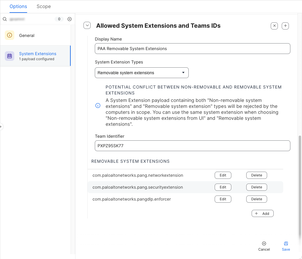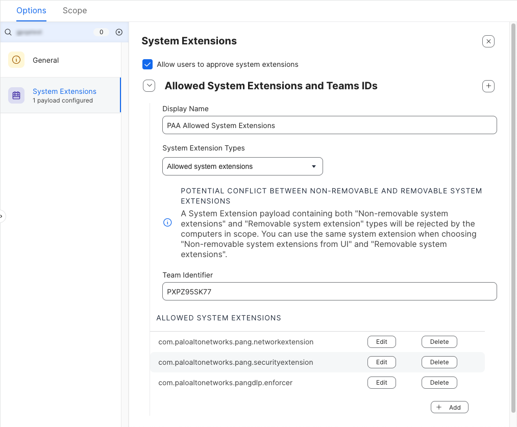 5. To avoid potential conflict between nonremovable and removable system extensions, configure removable system extensions for Prisma Access Agent:
