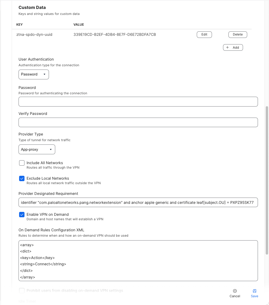 10. Select Enable VPN on Demand and enter the following On Demand Rules Configuration XML: