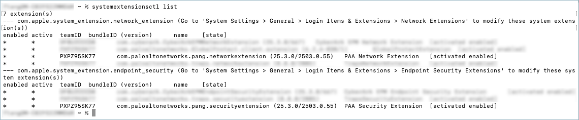 After you deploy the agent, you can run the systemextensionsctl list command on an endpoint to verify that the extensions have been loaded. For example: