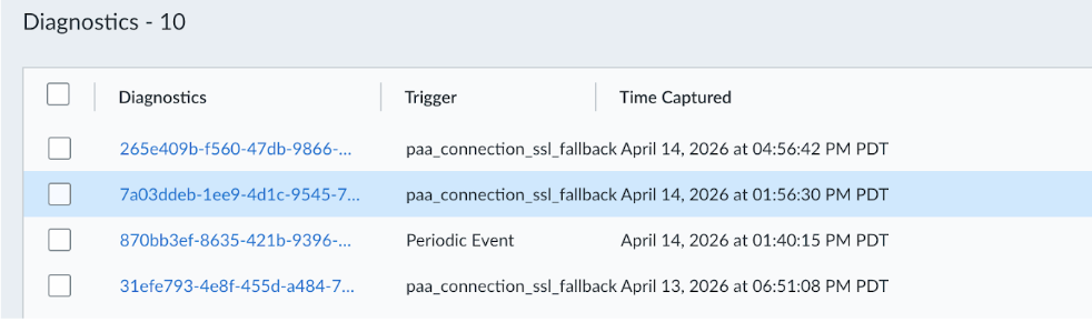 - (Prisma Access Agent 26.2) paa_connection_ssl_fallback—Event-triggered diagnostic collection caused by tunnel fallback from IPSec to SSL