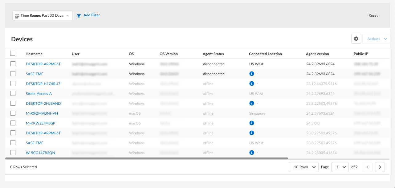 | Time Range | The period of time for which you want to show agent information according to when the Prisma Access Agent was last connected. You can choose to view the status of agents that have last connected in the Past 1 Hour, Past 24 Hours, Past 7 Days, Past 30 Days, or a custom time range. |