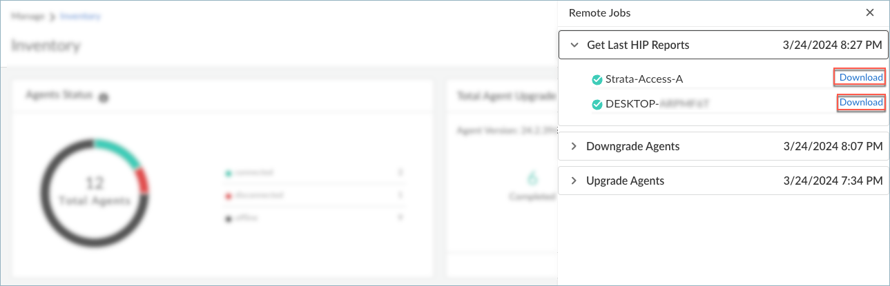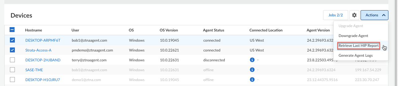 If you are viewing the details for an individual agent, you can also select ActionsRetrieve Last HIP Report from the individual details view.The retrieve last HIP report action is not available to administrators with the View Only Administrator role.In the Confirmation dialog, click Yes. The Prisma Access Agent sends the HIP report to the compliance service, which saves the HIP report and provides the service to download HIP reports.The Jobs button appears or changes to indicate that the download HIP report job has been added to the queue.