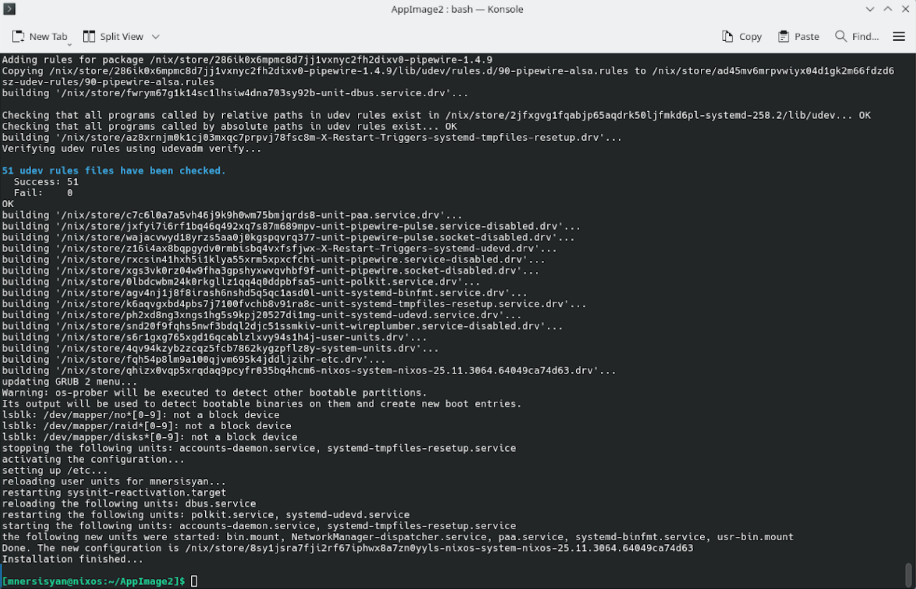 The following sample image shows the terminal output showing the successful completion of the NixOS installer script:
