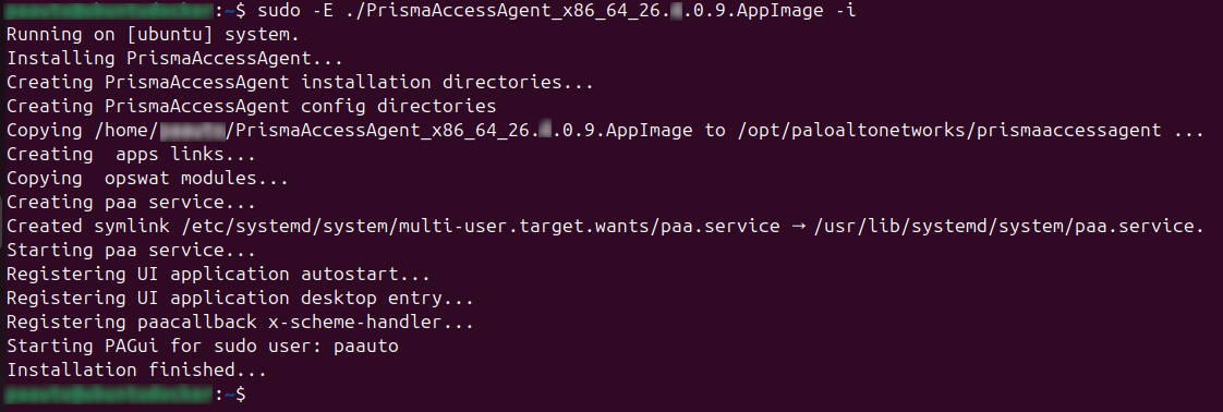 Install the Prisma Access Agent from the command line.sudo -E ./PrismaAccessAgent_<architecture>_<version>.AppImage -i