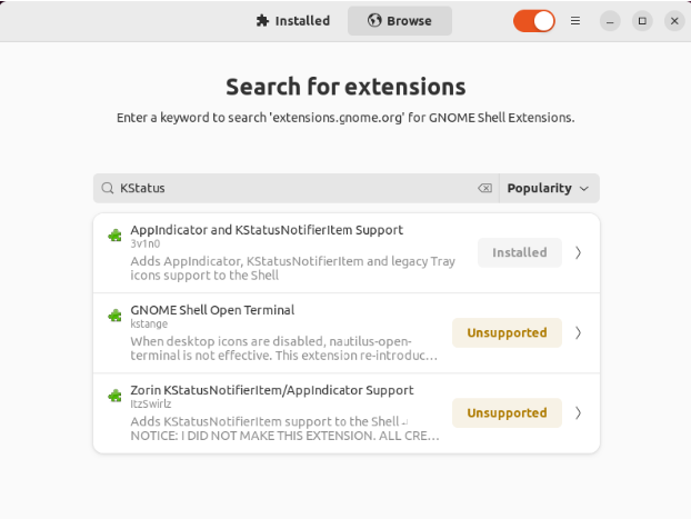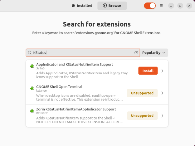 Enter KStatus in the search bar.Locate AppIndicator and KStatusNotifierItem Support in the search results and Install the extension.