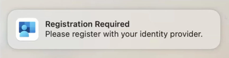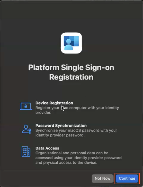 - Log into your Mac using your organization-provided credentials. This may include your password, Touch ID, Face ID, or smart card with PIN, depending on how your IT administrator has configured your device.When your administrator has pushed the Platform SSO profile to you macOS device, you will be notified to register with your identity provide (IdP). Click the notification to proceed.