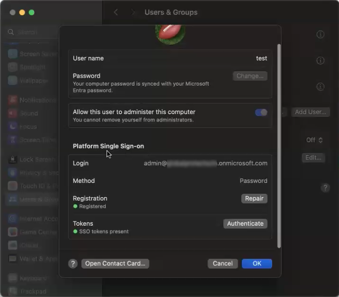 Once authentication completes successfully, you can access your organization's applications and resources through the secure network connection. The agent maintains this connection as long as you remain logged into your device.If you experience authentication issues, ensure that you have logged into your Mac using your organization-provided credentials and verify your network connection can communicate with your organization's authentication services. If authentication fails, the agent will prompt you to enter credentials manually as a fallback option.(Optional) Verify that SSO is enabled on your device.- Go to System SettingsUsers & Groups.Select the information icon for you user name and verify that there is a Platform Single Sign-on section showing the same IdP login information, login method, and status of the registration.