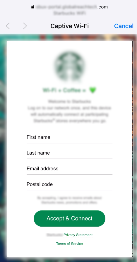 (Prisma Access Agent 25.7.0) When using Prisma Access Agents configured for per-app deployment, you will receive a notification if you connect to a network that requires captive portal authentication, such as public Wi-Fi at hotels, cafes, or airports.- Tap on the notification to proceed.The captive portal login page will appear in the embedded browser. Enter your credentials or accept the terms of service as required by the network provider. For example: