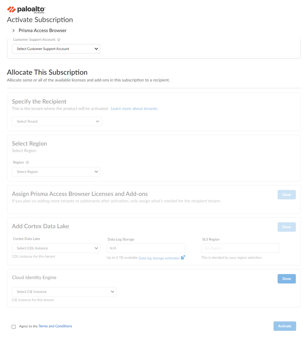 The service uses this email address for the user account assigned to the tenant that you use for this license. This tenant, and any others created by this email address, will have the Superuser role.If you have only one Customer Support Portal account associated with your username, the Customer Support Account is prepopulated.If you have more than one Customer Support Portal account, there are other behaviors you can expect.Allocate the product to the Recipient of your choice.The name provided matches your Customer Support Portal account for convenience. You can use the name provided or change it.Choose the data ingestion Region where you want to deploy your product.Assign the Prisma Access Secure Enterprise Browser Licenses and Add-ons- Select Prisma Access Secure Enterprise Browser.This is similar to allocating PA Mobile User licenses. You will be able to partially allocate and activate Prisma Browser licenses across multiple Prisma Access tenants. For example: