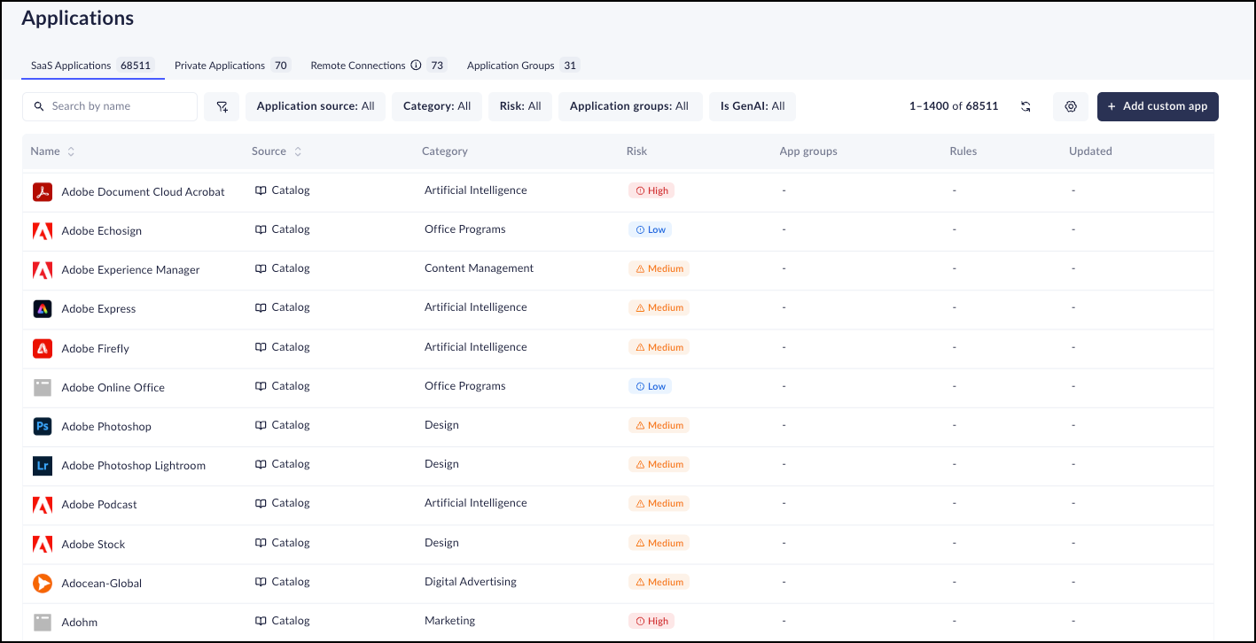 After you create your applications, you can now create Application Groups and assign policies to these groups. Any changes to the content of an Application Group will automatically update the list of apps in the assigned policy. Application Groups can contain a mix of any app type (from catalog, custom, and private). You can use application groups for scenarios such as:- Manage Policy at Scale: You can organize your apps into different groups and set basic rules for each group. This way, you can add or remove apps from the groups without needing to change the rules themselves.