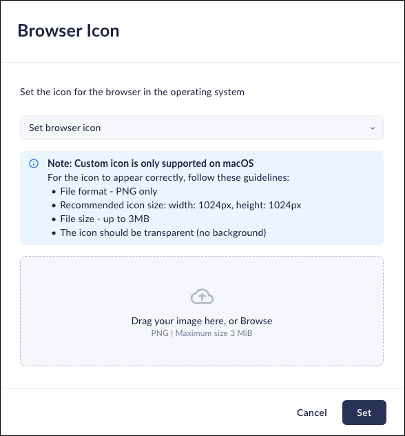 Mobile Browser - No supportThis feature is only available on macOS.Organizations that use the Prisma Browser can use their own internally designed icon if they so desire. If not, you can make sure that only the default Prisma Browser icon is used.- From Strata Cloud Manager, select ConfigurationPrisma Browser PolicyProfilesBrowser CustomizationSelect Browser Icon.Select one of the following options: