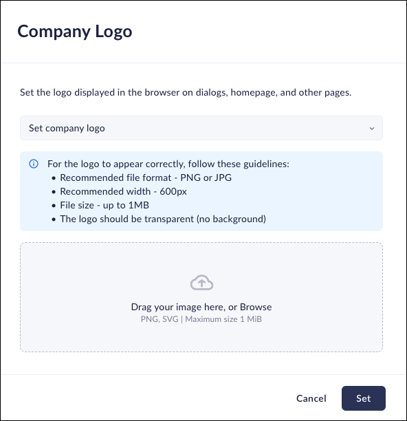 - Set Company Logo- Drag the logo image or browse for it.The logo image must conform to the following requirements.