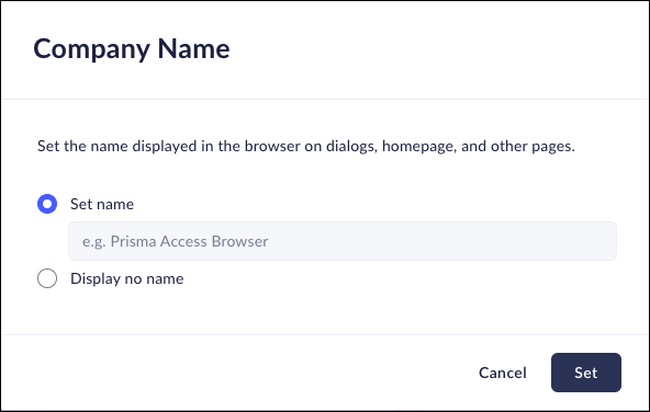 - Set name - Enter the name that is to be displayed on the top of the homepage. It will appear as The <company name> browser - Powered by Palo Alto Networks.
