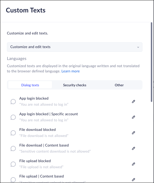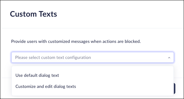 Mobile Browser - No supportYou can modify the default texts that appear in user-facing dialogs and other pages. This can help describe additional information regarding policies - for example - why a particular policy isn't allowed, and if there is anything that can be done to allow for special permission.This feature can also be used for localizing the information if required.- From Strata Cloud Manager, select ConfigurationPrisma Browser PolicyProfilesBrowser CustomizationSelect Custom Texts.Select one of the following options: