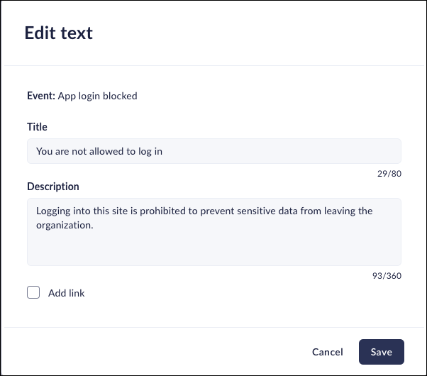 - Customize and edit dialog texts - Select the dialog that you want to edit, and click the pencil icon. In the Edit Text window, edit the Title and Description. If needed, add new line characters to provide some formatting.There are three tabs for this option: