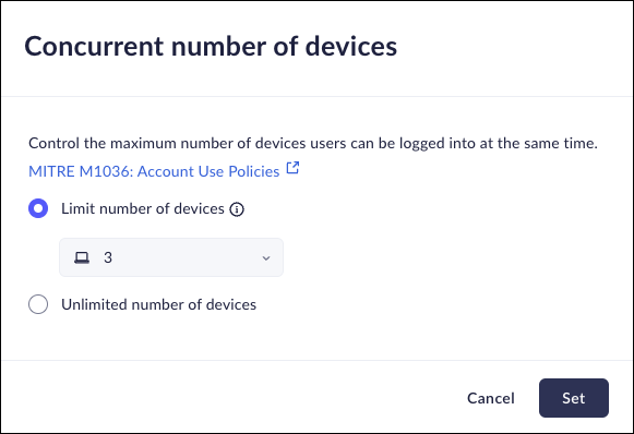 • Limit number of devices - You will be able to limit the number of browser session concurrently. You can set the maximum to between 1 and 5 concurrent sessions per user.