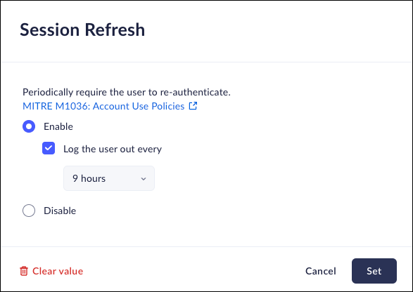 • Enable to enable Session Refresh, then select Log the user out every: and select an appropriate time frame, ranging from 1 hour to 30 days
