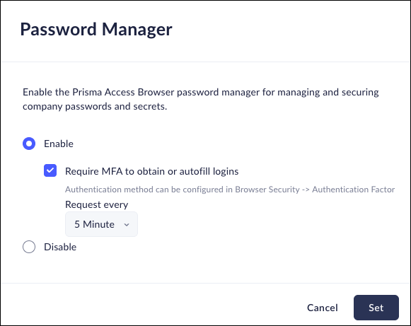 • Require MFA to obtain or autofill logins - Select this option to determine how often your users will need to re-enter their MFA for a new login. You can require that the MFA be entered every time the information from the Password manager is accessed, or they will need to enter their MFA for a new login every selected time period. The current range is between 1 and 30 minutes.