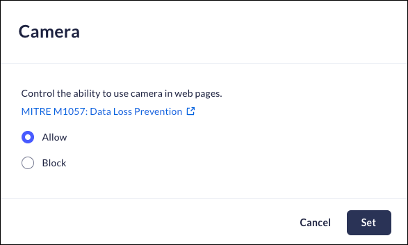 This feature controls whether or not websites that match the URL, application, or category in the rule have access to the device camera. This control isn't affected by specific content inspection - the settings in the When contains schedule. To set the Camera control: