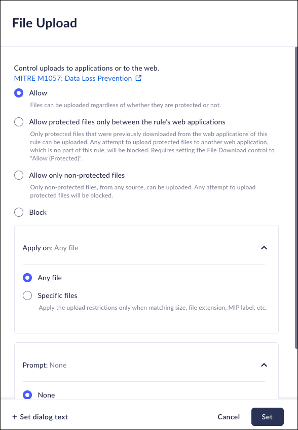 • Allow -the Prisma Browser will allow all uploads.