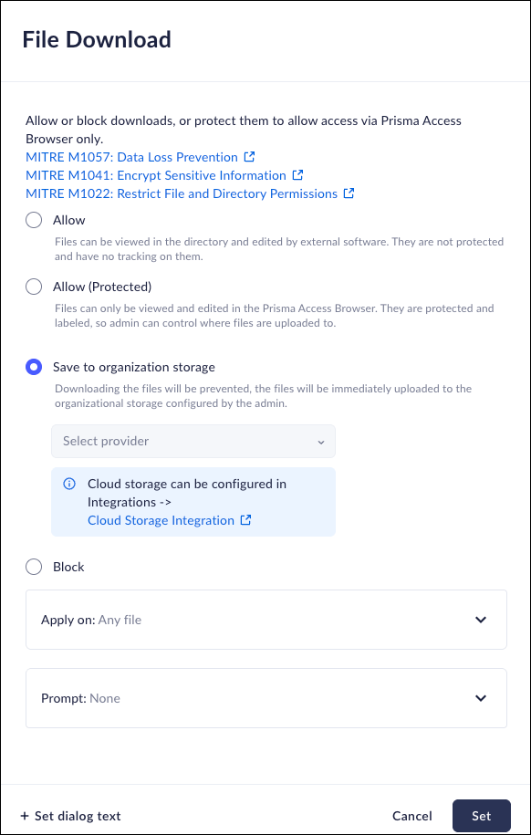 • Allow (Protected) – the Prisma Browser will allow downloads that can open only in the browser.