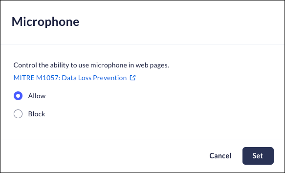 This feature controls whether or not websites that match the URL, application, or category in the rule have access to the device microphone. this control isn't affected by specific content inspection - the settings in the When contains schedule. To set the Microphone control: